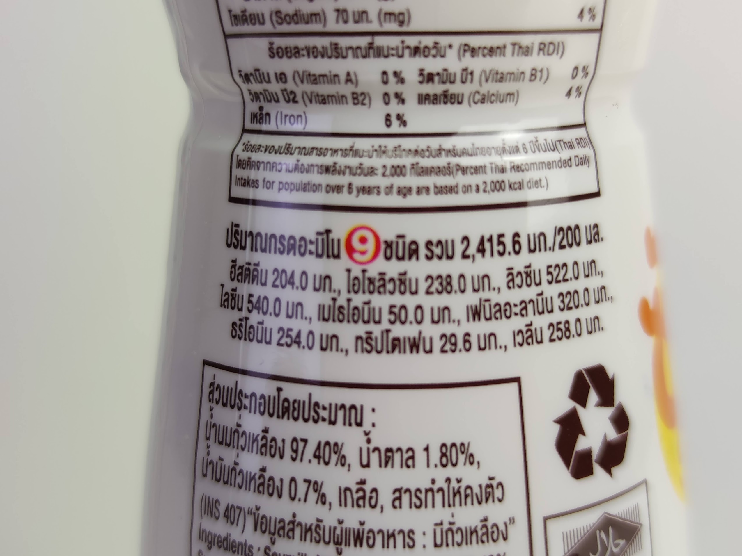 - มีน้ำนมถั่วเหลือง 97.40% ซึ่งเป็นถั่วเหลือง ที่คัดเฉพาะถั่วเหลืองเต็มเมล็ดพันธ์ุดีพิเศษ จากแคนาดา